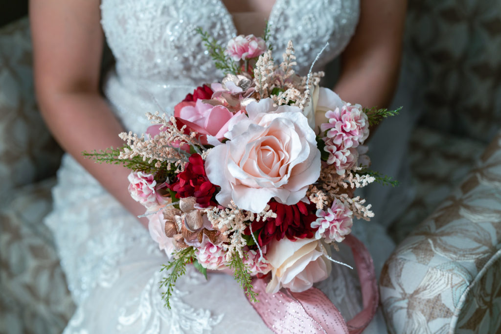 Central Illinois Bride holding her bouquet at Eastland Suites Hotel which is where she got married.